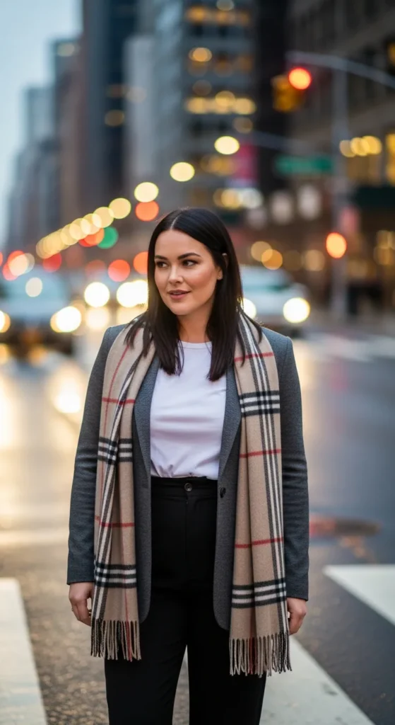 Choose a neutral plaid scarf for visual depth. The pattern adds dimension that enhances the blazer’s clean lines.