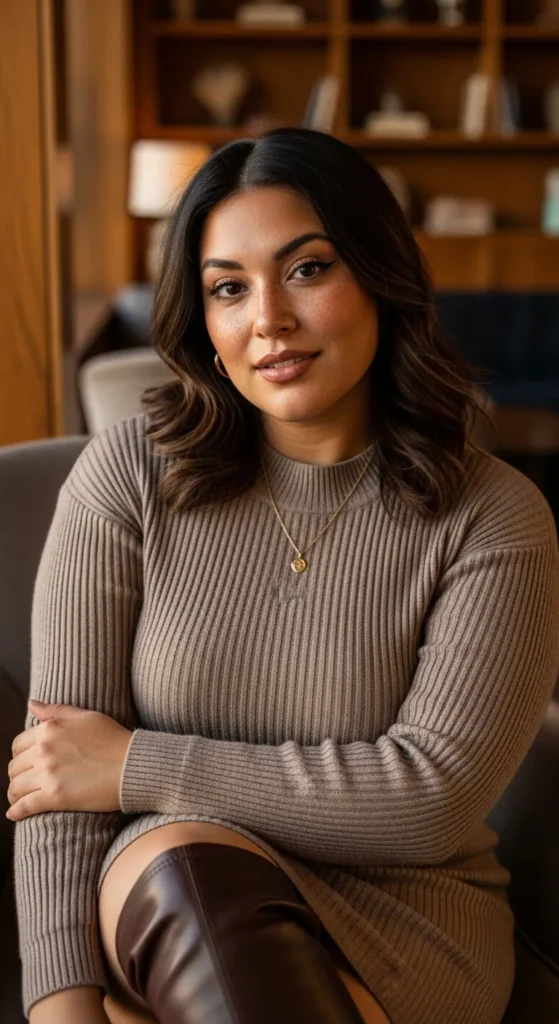 A ribbed sweater dress hugs in all the right places without feeling clingy, bringing warmth and softness. Paired with knee-high boots, it becomes a chic silhouette that moves beautifully and feels effortlessly feminine.