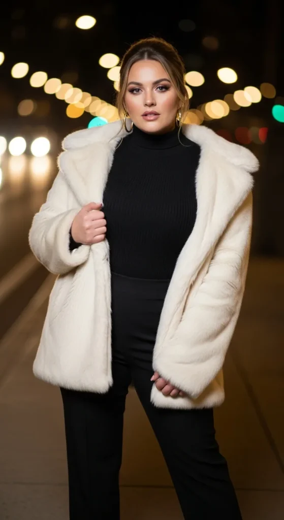 A sleek turtleneck grounds the drama of a faux-fur coat, giving the outfit a bold yet controlled energy. It’s a combination that feels confident and glamorous without going over the top.