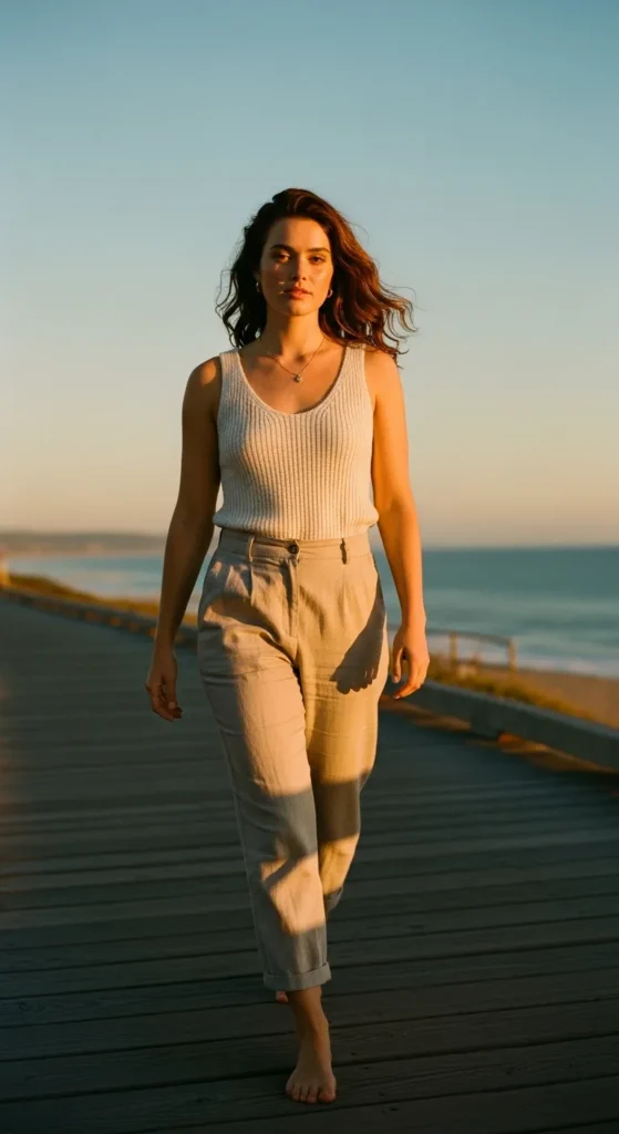 1. Coastal Knit Tank and Flowing Linen Pants for Soft Night Walks
