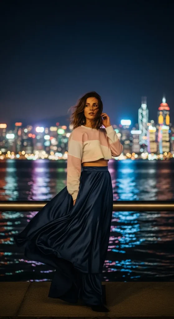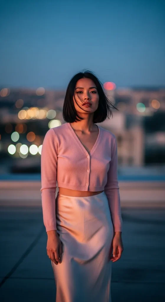 Soft cropped cardigan layered over satin slip skirt brings contrast of cozy and sleek. It feels perfect for breezy rooftop dinners where the night air is cool but the mood stays warm and romantic.