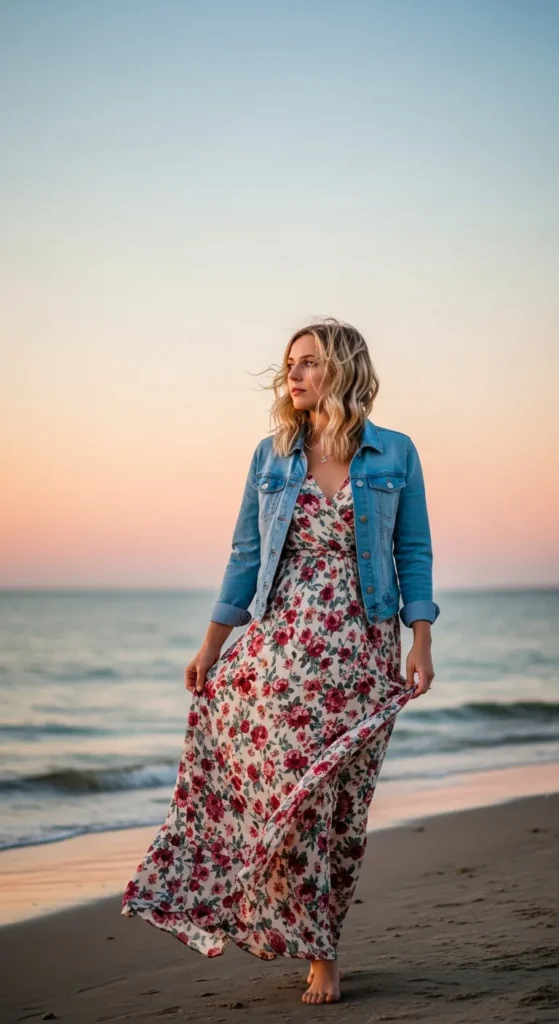 Flowy maxi dress paired with a lightweight denim jacket gives that easy summer romance feeling while staying warm. Perfect for beachside nights or casual walks when the breeze picks up and the sky turns soft.