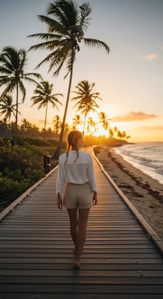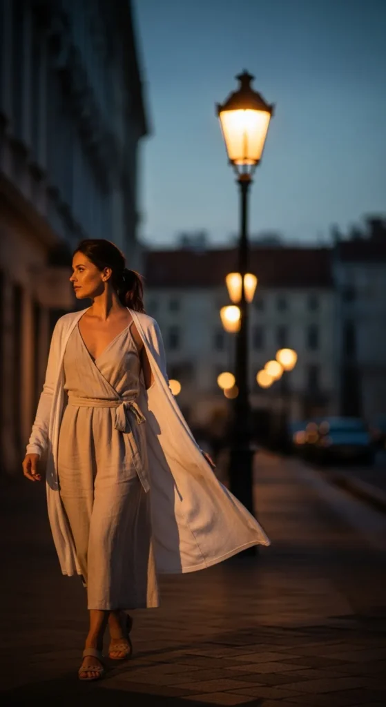A linen romper styled with a soft wrap cardigan gives a breathable yet cozy feel. Ideal for summer evenings when the temperature drops slightly and you’re out enjoying slow peaceful strolls through warm-lit streets.