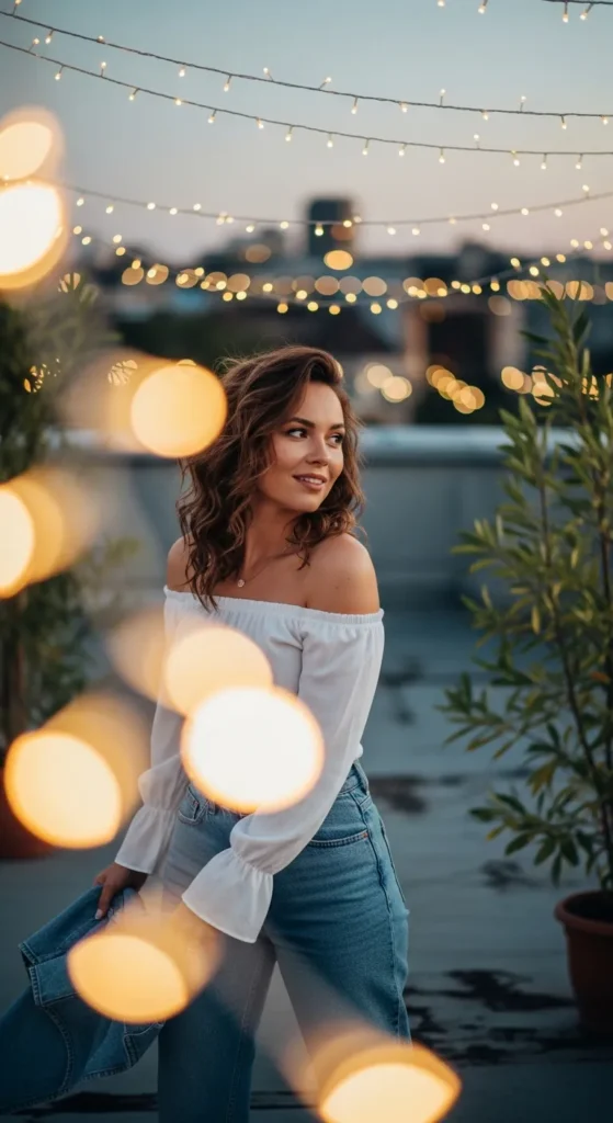 Off-shoulder tops combined with relaxed jeans creates an easygoing yet slightly flirty vibe. Ideal for summer nights when the breeze is light and conversations stretch late into warm glowing city evenings.