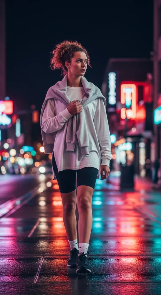 An oversized cotton shirt paired with fitted bike shorts and a light hoodie creates an effortless street-cool vibe. Ideal for chilly summer nights when comfort matters but you still want relaxed, put-together energy.