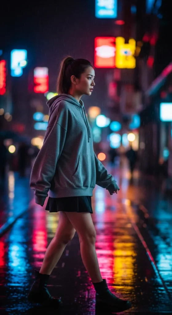Relaxed hoodie paired with mini skirt blends sporty comfort with playful edge. Perfect for cool summer nights in the city when neon lights glow and the air carries a gentle chill.