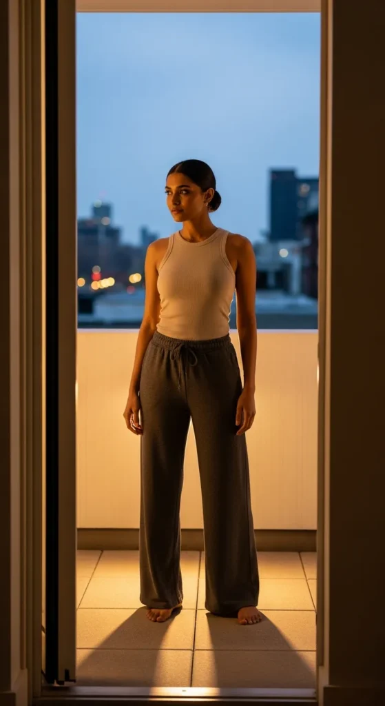 Ribbed tank tucked into soft wide-leg joggers creates a laid-back yet stylish silhouette. Perfect for cold summer evenings in the city when you want comfort, movement, and effortless street style energy.