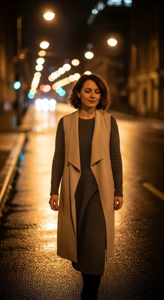 A soft knit dress layered with a longline vest adds subtle structure without losing comfort. Perfect for cool summer nights under soft city lights when you want to feel effortlessly put together and cozy.