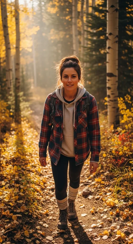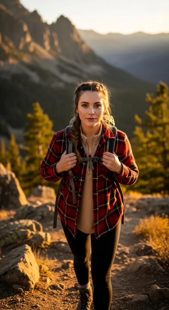 A soft plaid flannel shirt over a thermal base and fitted leggings creates the perfect cozy trail vibe. Ideal for chilly Colorado mornings when you want warmth without losing that effortless, outdoorsy charm while hiking scenic mountain paths.