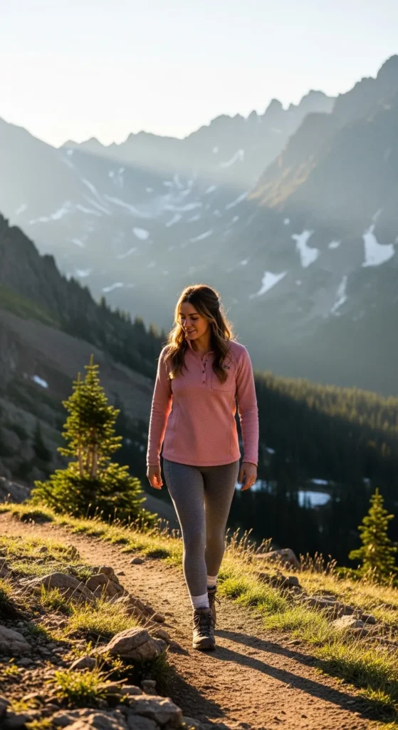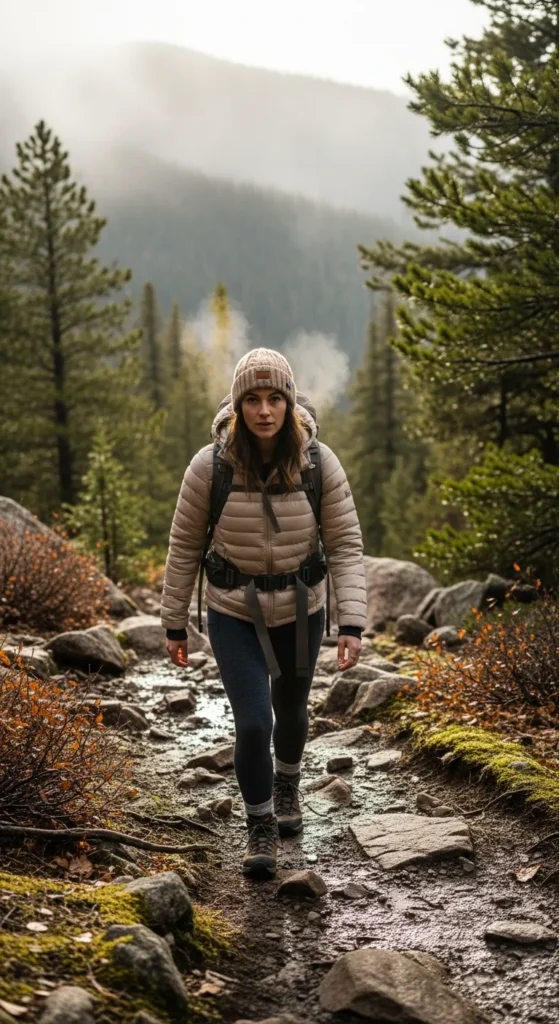 A lightweight beige puffer jacket paired with fleece-lined leggings keeps you warm during breezy alpine starts. The outfit feels soft, breathable, and perfect for long scenic walks through fog-covered Colorado valleys.