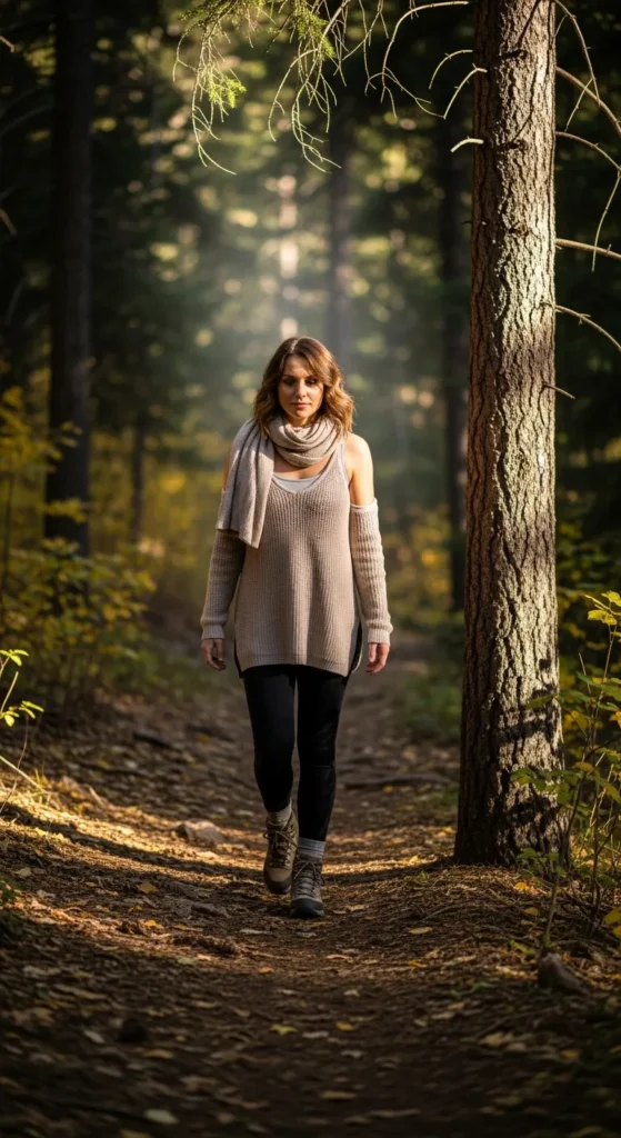 A lightweight knit sweater layered over a breathable tank and hiking leggings brings cozy charm to cool Colorado air. Ideal for slow scenic hikes through forested trails.