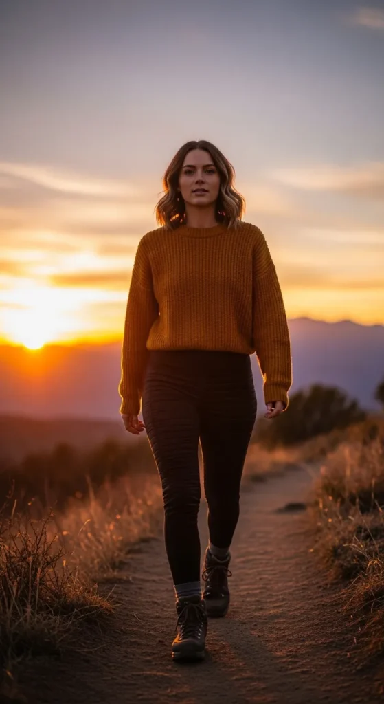 A warm mustard knit sweater with insulated leggings brings cozy sunset energy to mountain trails. Perfect for ending hikes as the sky turns orange and pink.