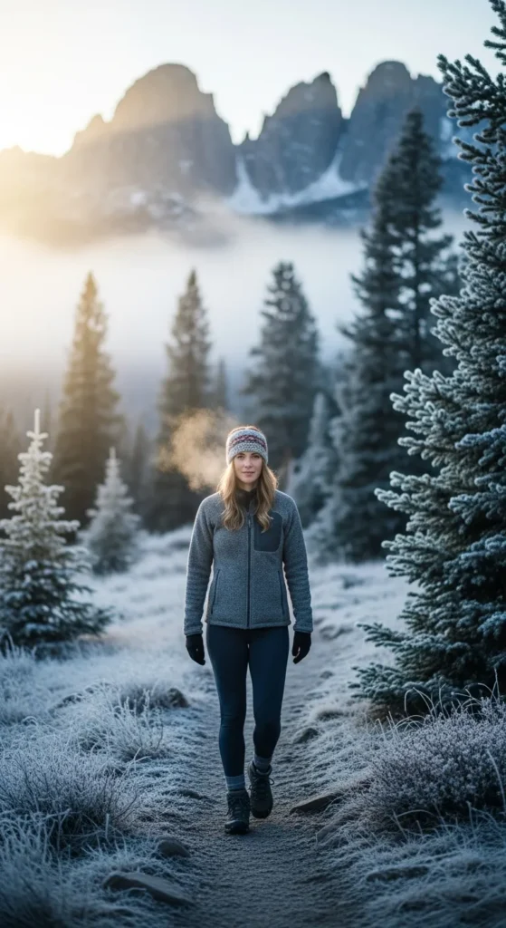 A heavy insulated jacket with thermal base layers creates the ultimate frost-ready hiking outfit. Perfect for high-altitude Colorado peaks covered in snow.
