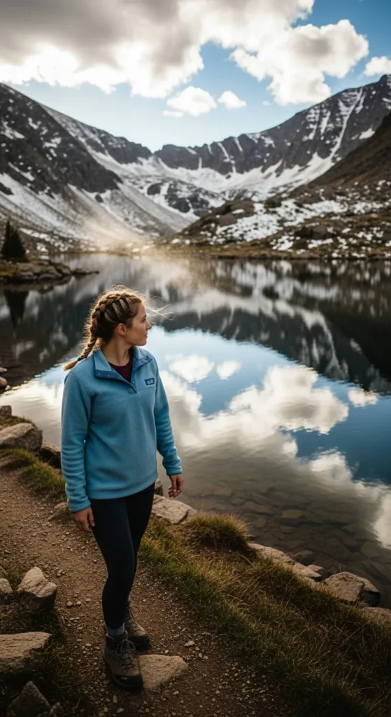 A sky-blue fleece pullover paired with dark hiking tights creates a refreshing, cool-toned mountain look. Ideal for breezy trails near Colorado’s alpine lakes.
