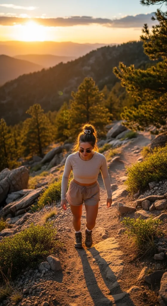 A soft beige long sleeve top with light brown hiking shorts creates a warm, sunlit hiking aesthetic. Perfect for golden hour hikes across Colorado’s open trails.