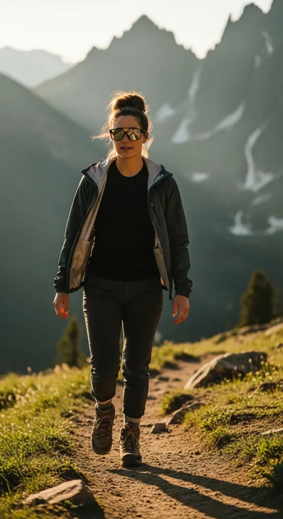 A sleek black base layer with lightweight jacket creates a strong, modern hiking aesthetic. Perfect for confident hikers exploring rugged Colorado trails.