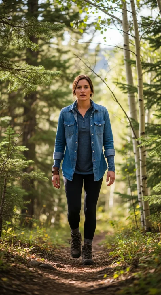 A lightweight denim shirt layered over a thermal base with black hiking leggings gives a rustic mountain aesthetic. Perfect for casual scenic hikes in Colorado forests.