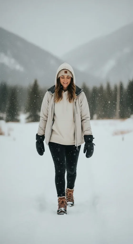 A thick cream hoodie layered under a windbreaker jacket makes this outfit perfect for snowy Colorado trails. It feels soft, warm, and ideal for early winter hikes with drifting snowflakes.