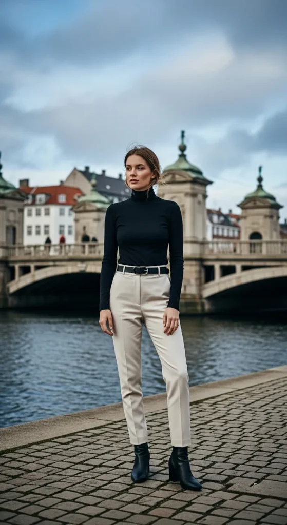 A fitted black turtleneck paired with cream tailored trousers is timeless and endlessly flattering.