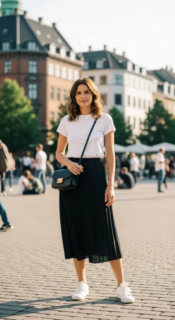 A structured white boxy tee tucked into a black pleated midi skirt blends softness and shape beautifully.