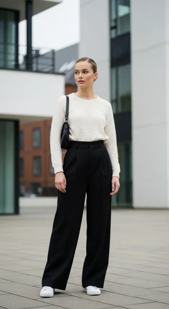 2. Cream Knit Sweater with Wide Black Trousers