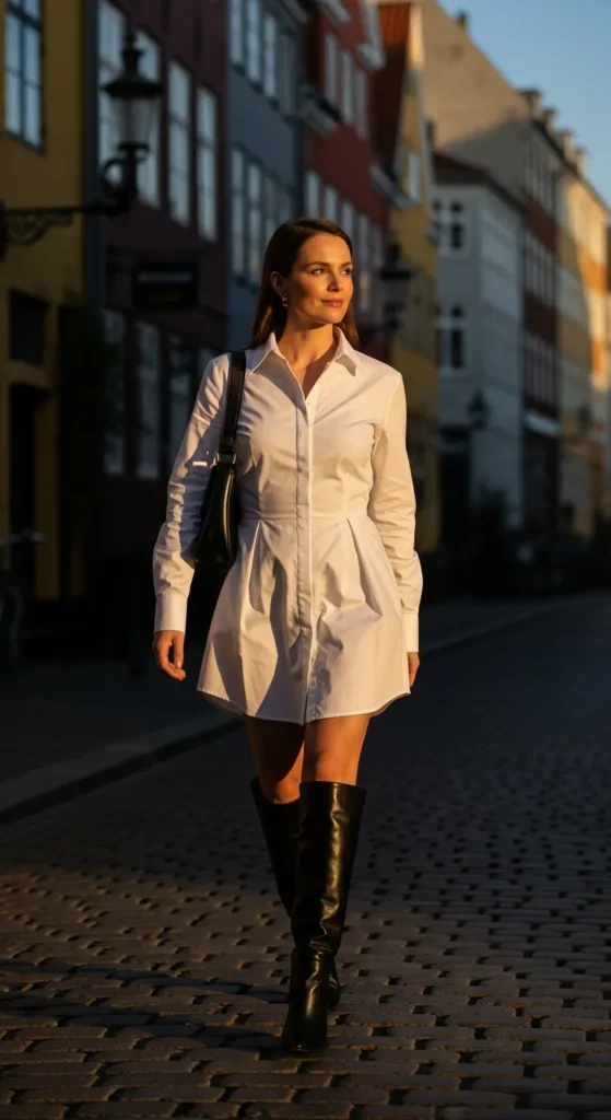 A minimalist white shirt dress styled with tall black boots feels bold yet clean.