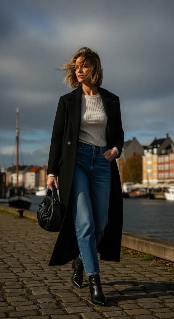A floor-length black coat over relaxed mid-wash denim and a fitted ribbed top feels dramatic yet simple. It moves beautifully in the wind.