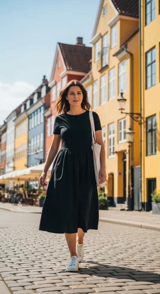 A clean black midi dress styled with crisp white sneakers feels practical yet chic for summer exploring.