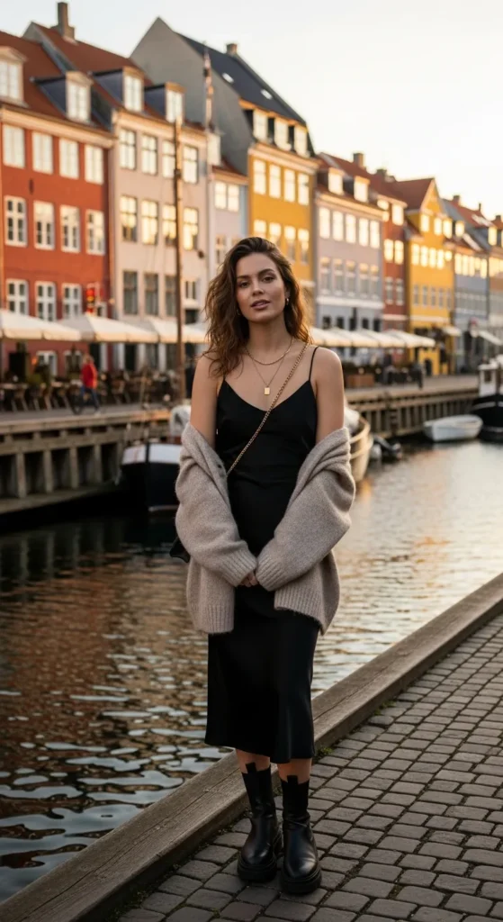 A matte black slip dress layered with a soft oversized cardigan is perfect for transitional weather.