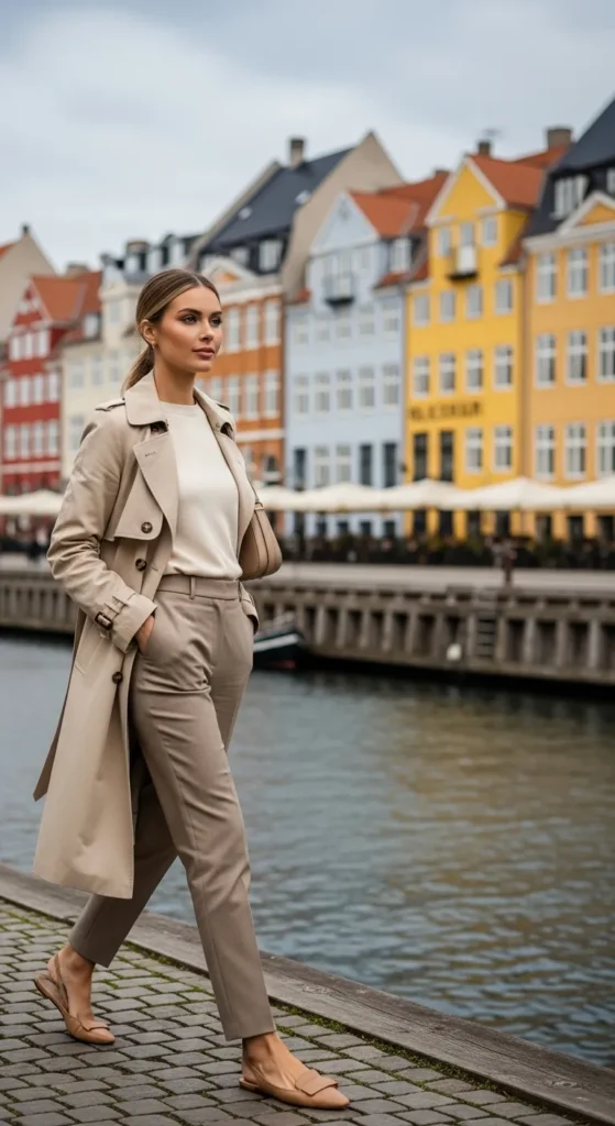 A beige trench layered over matching tailored trousers creates a cohesive minimal moment that feels powerful yet understated.