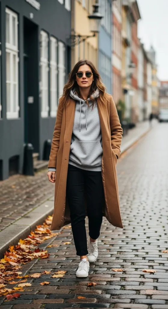 A soft grey hoodie layered under a structured wool coat mixes comfort and polish.