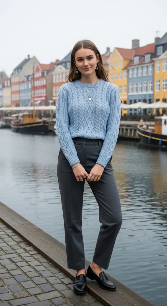 A muted pastel blue sweater paired with straight charcoal trousers keeps color subtle and Scandinavian-approved.