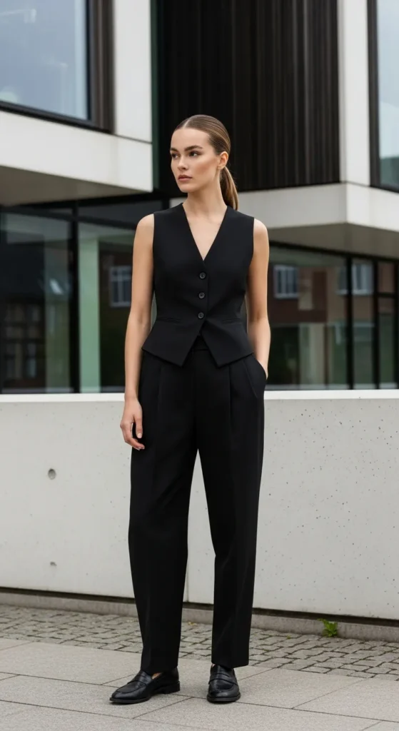 A tailored black vest worn alone with loose high-waisted trousers feels strong and modern.