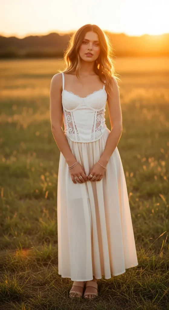 A lace-trim corset paired with a flowy cotton maxi skirt feels dreamy and feminine. It’s the kind of outfit that floats beautifully in golden hour light.
