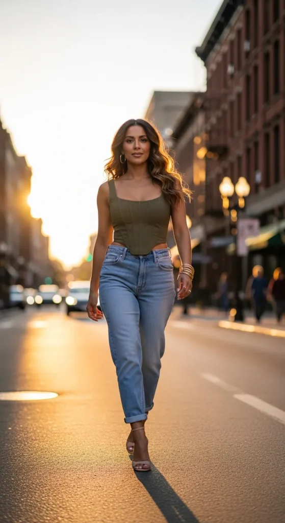 An olive-toned corset with relaxed boyfriend jeans feels earthy and modern. It’s structured but not overly fitted, creating an easy balance.