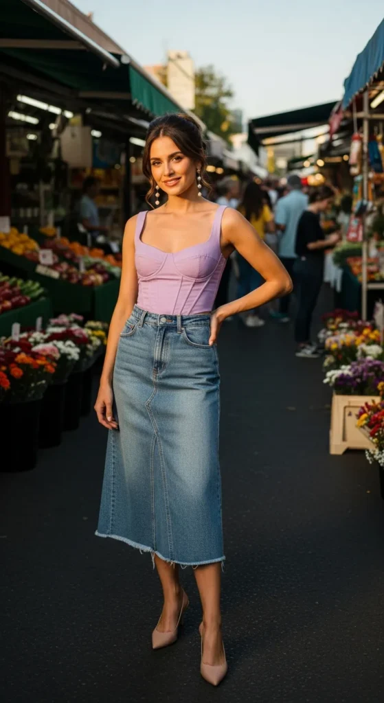 A pastel corset tucked into a denim midi skirt blends sweet and structured beautifully. It’s modest yet playful and works well for daytime events.