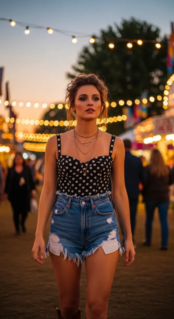 A subtle polka dot corset and denim cutoffs give playful vintage energy without feeling costume-like. It’s flirty and perfect for music festivals or summer fairs.