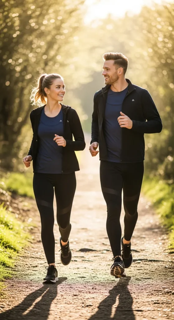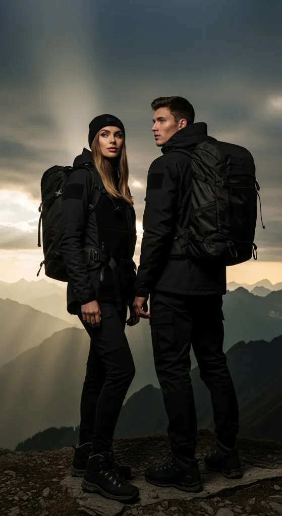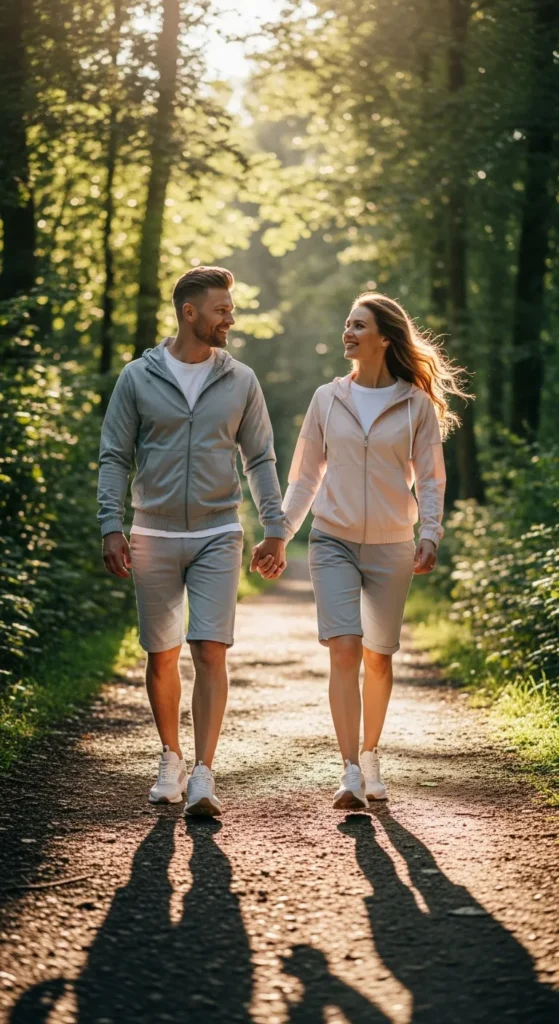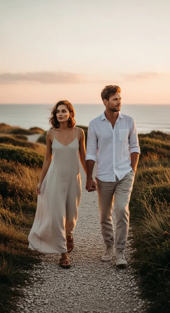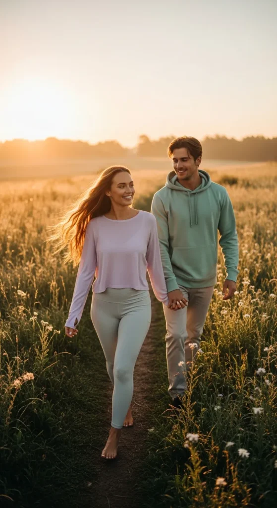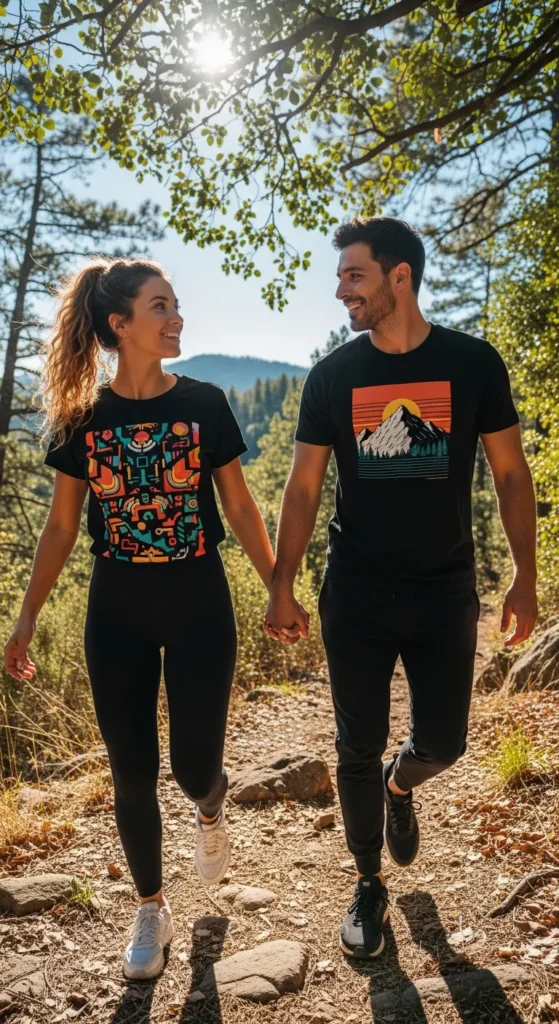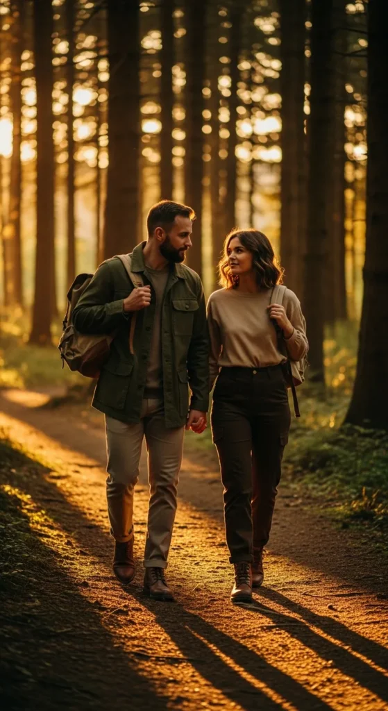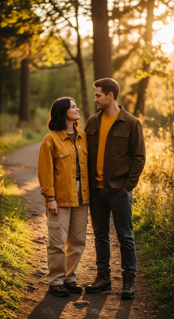 Think sleek leggings, fitted tees, and performance jackets in coordinating colors. This outfit keeps both partners looking active and stylish while staying functional for long hikes.