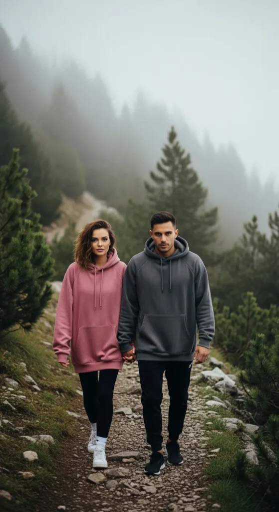 Soft oversized hoodies in coordinating shades like blush and grey make this look feel warm and intimate. Paired with leggings and joggers, it’s perfect for early morning hikes or cooler weather strolls.