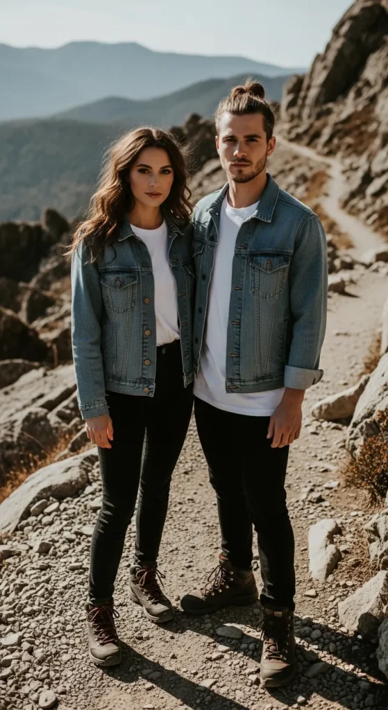 Denim jackets paired with neutral basics create an effortlessly cool vibe. The matching denim detail adds unity without feeling forced, making it perfect for casual hikes where comfort meets style.