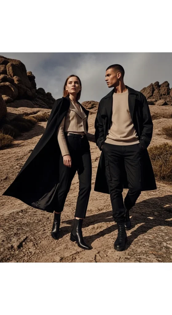 A mix of black and beige creates a timeless, chic contrast. It’s simple yet incredibly stylish, perfect for couples who love understated fashion.