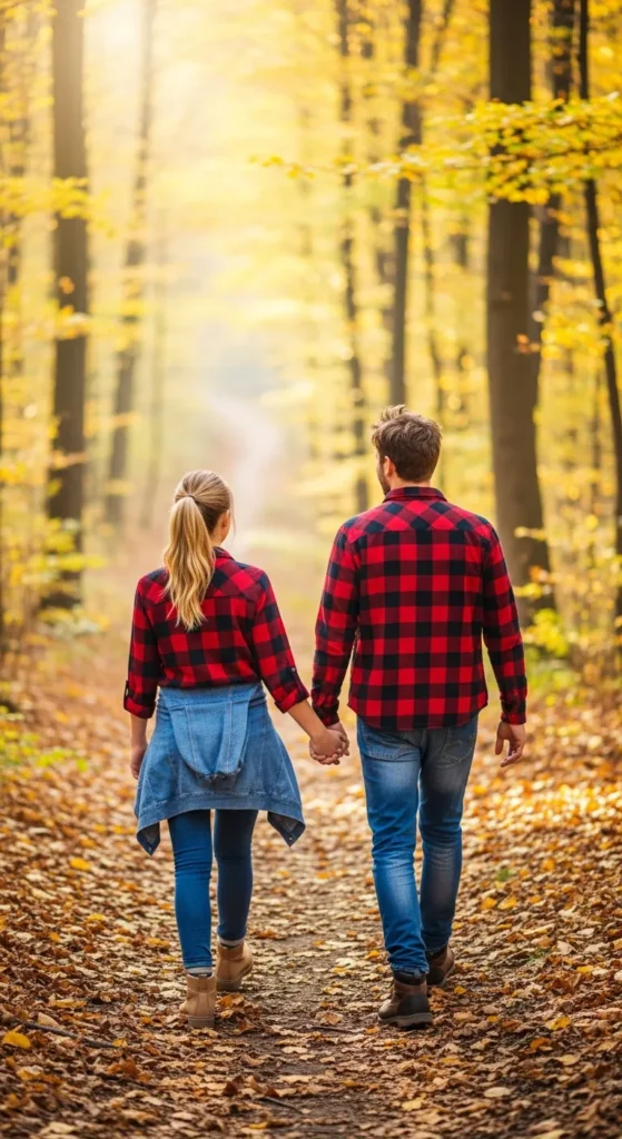 Matching plaid shirts layered over basic tees create a rustic, outdoorsy charm. It’s cozy, classic, and perfect for fall hikes with a romantic countryside feel.