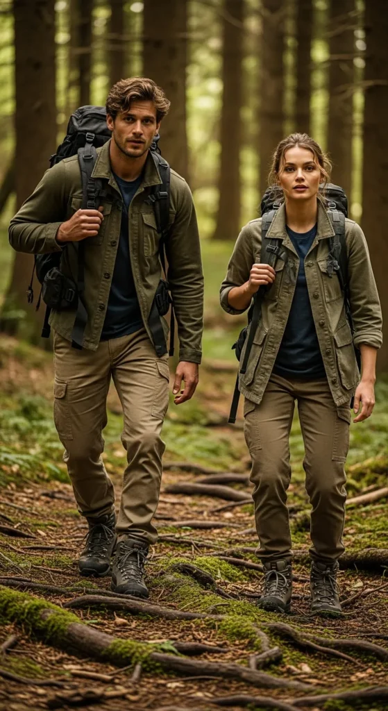 Cargo pants, utility jackets, and practical boots create a rugged yet stylish outfit. Matching details like pockets and straps bring a functional aesthetic to your couple style.