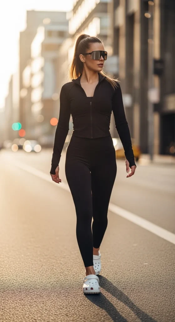 A matching sports set with a lightweight zip jacket turns Crocs into a gym-to-street essential. This outfit is perfect for active days that still require style.