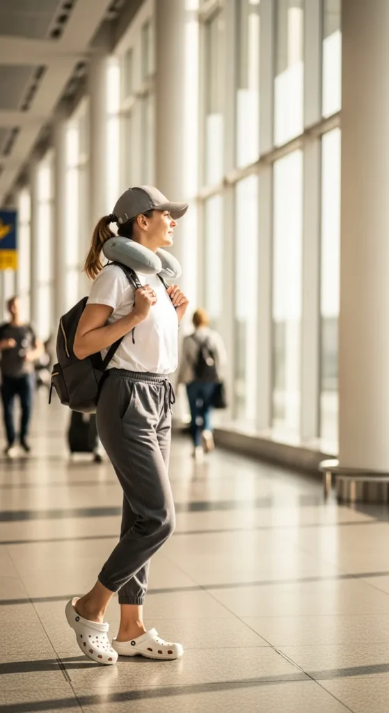 A simple tee with joggers is a go-to comfort outfit elevated by Crocs. It’s perfect for travel days or relaxed home outings.
