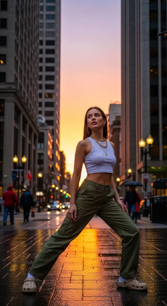Baggy cargo pants paired with a fitted cropped tank create a balanced silhouette with Crocs grounding the look in comfort. It’s a modern street-style outfit with relaxed confidence.