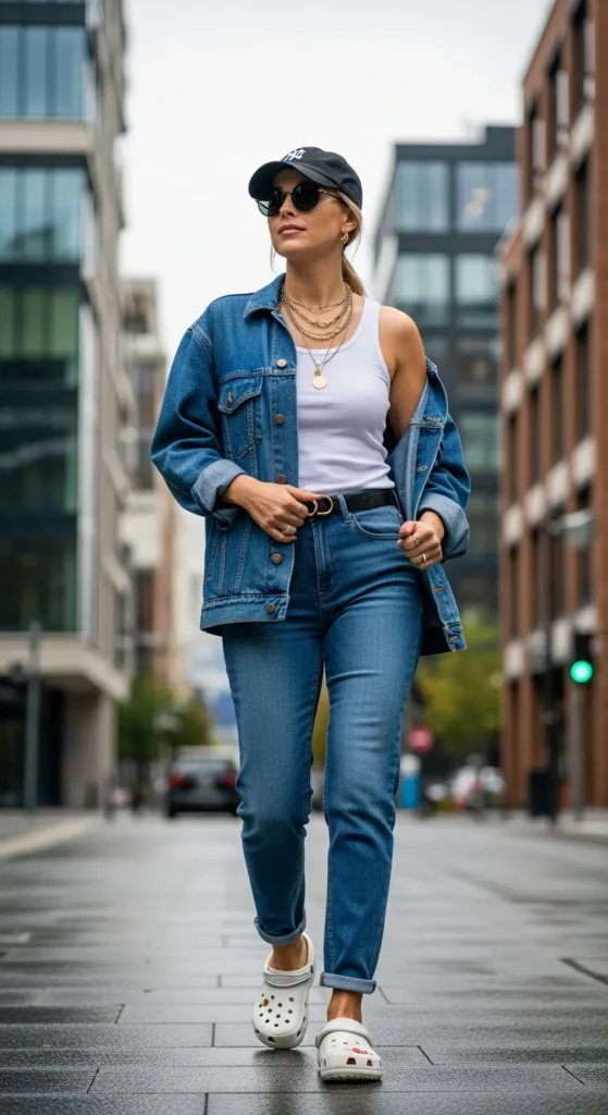 Layering a denim jacket over basics instantly makes Crocs feel more styled. This outfit is perfect for transitional weather days.