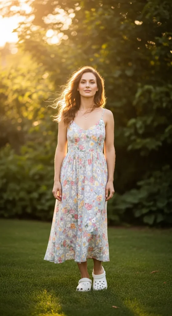 A soft floral sundress paired with Crocs creates a dreamy feminine vibe that still feels grounded. This look is perfect for warm days when you want comfort without sacrificing a soft, romantic aesthetic.