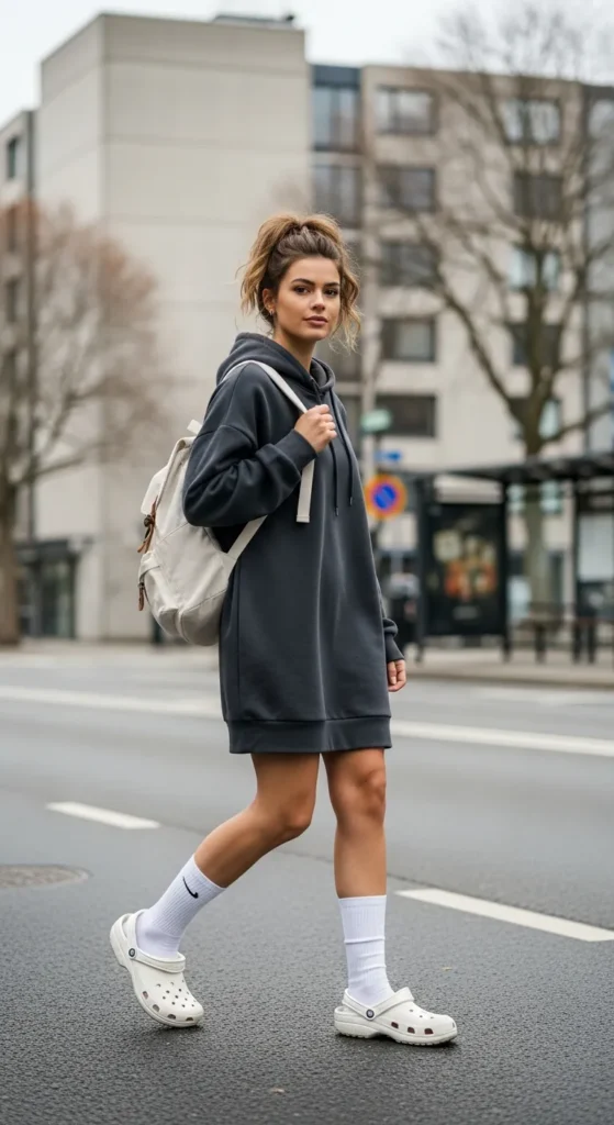 A hoodie dress paired with Crocs creates the ultimate comfy-girl outfit. It’s perfect for lazy days when you still want a put-together street look.