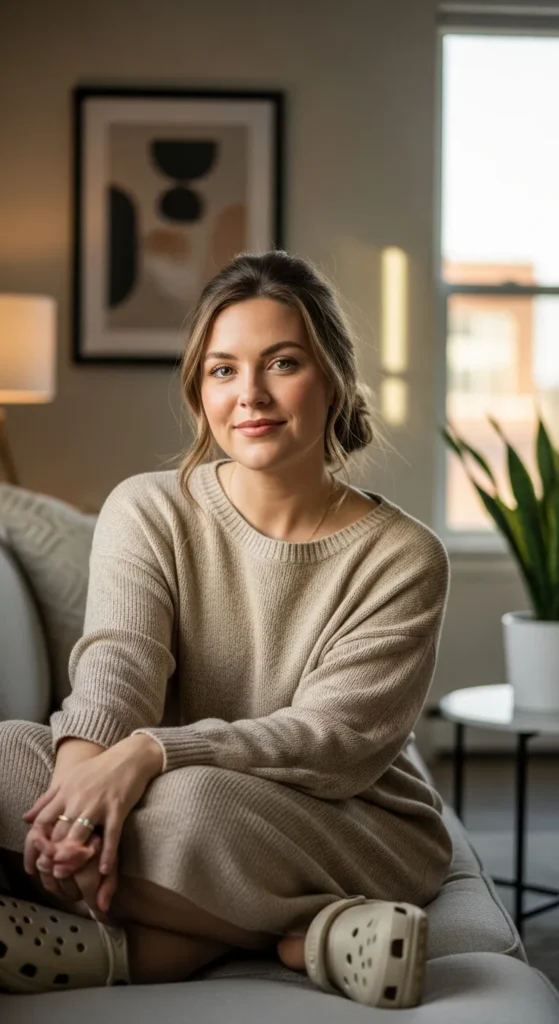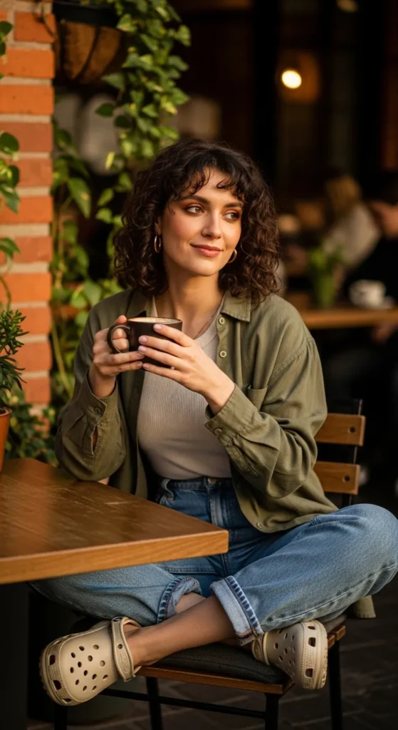 Stylist Suggestion: Add fuzzy socks slightly visible above Crocs for a cozy aesthetic that enhances the soft, relaxed vibe.